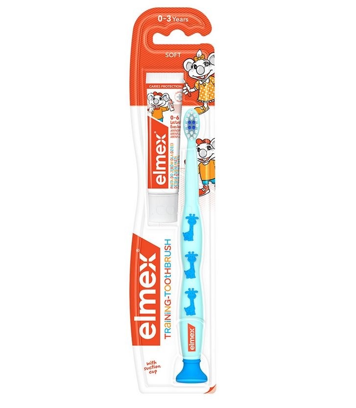 Izobraževalna zobna ščetka za otroke starosti od 0 do 3 let. Mehka majhna glava je zlasti primerna za mlajše otroke Rumena vlakna označujejo ustrezno količino zobne paste, ki jo je potrebno uporabiti. Mehka vlakna z okroglimi konicami zagotavljajo mehko čiščenje mlečnih zob. Ergonomsko oblikovan ročaj je razvit posebej za otroške dlani in pomoč staršev pri umivanju zob.